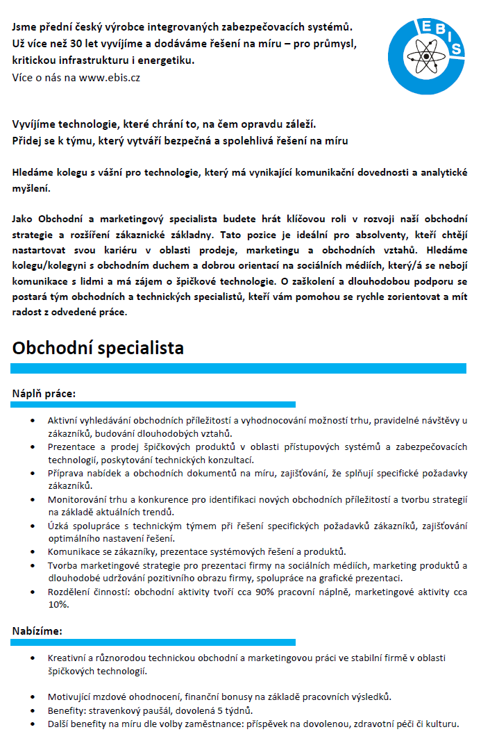 Společnost EBIS se zaměřuje na integraci špičkových řešení v oblasti zabezpečení objektů vysoké důležitosti, zejména v kritické infrastruktuře, průmyslu a jaderné energetice.
